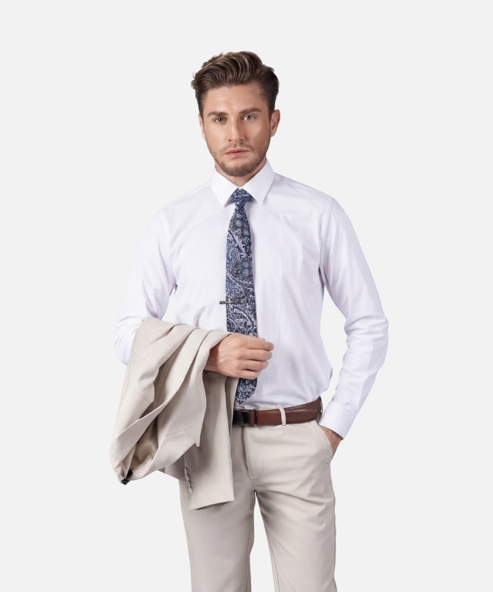 חולצה מכופתרת בצבע לבן קלאסי בגזרת Slim Fit, המעניקה מראה אלגנטי, נקי ומוקפד. חולצה זו היא פריט חובה במלתחה של כל גבר, ומתאימה לשילוב עם חליפה, מכנס מחויט או לבוש חצי־רשמי.