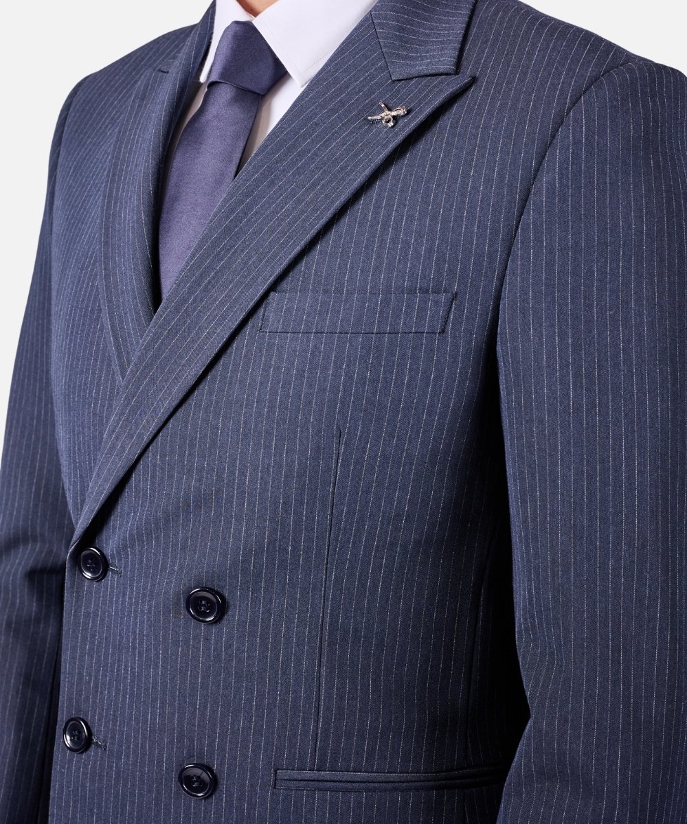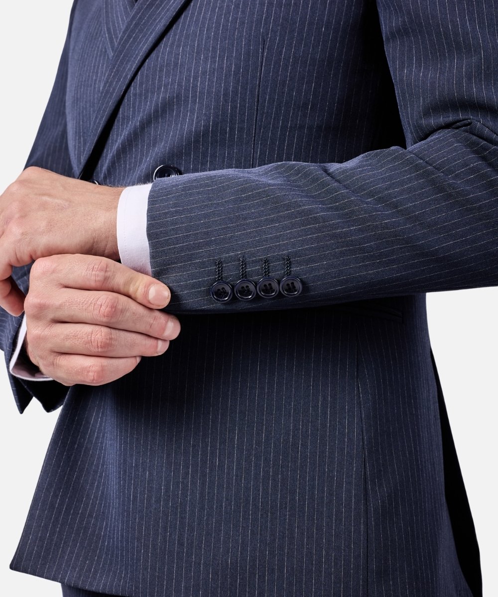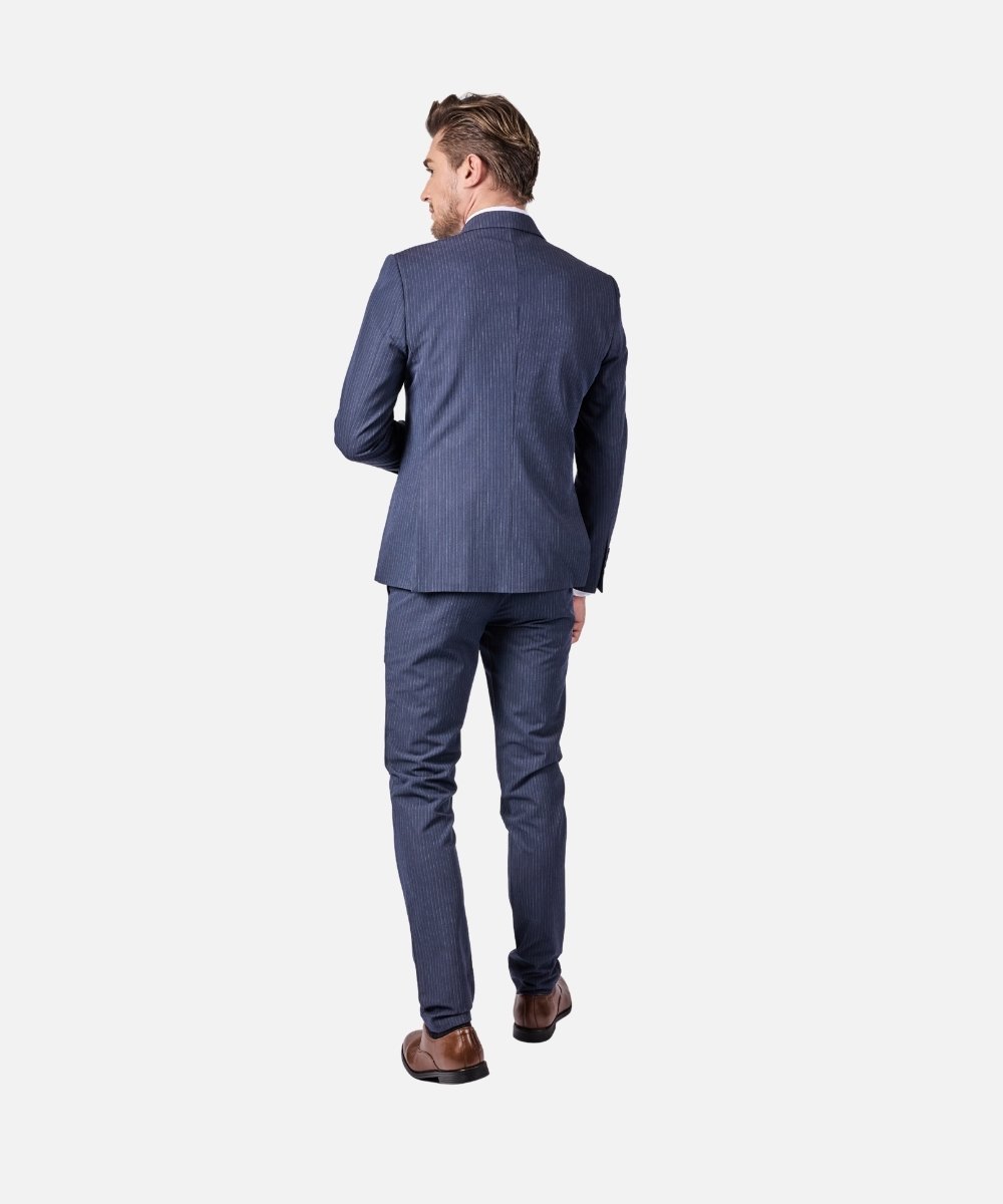 חליפת גברים אלגנטית בצבע כחול עם פס עדין בגזרת Super Slim Fit, המעניקה מראה מחויט, חד ומרשים במיוחד. החליפה כוללת ז’קט בעיצוב כפול כפתורים (4 כפתורים) ומכנסיים מחויטים, היוצרים שילוב מושלם בין אלגנטיות קלאסית לסטייל אירופאי מודרני.