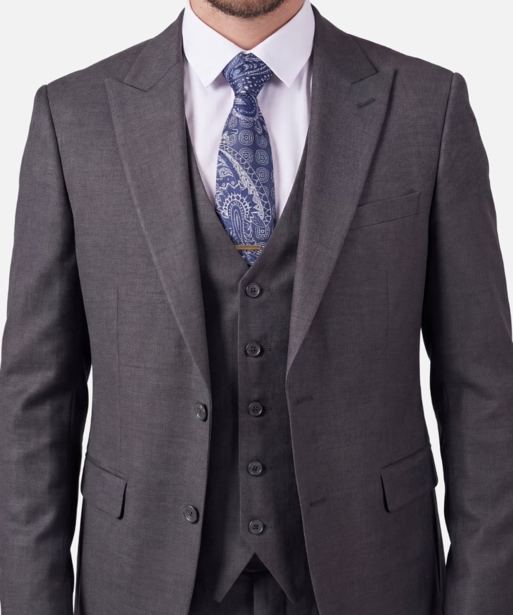 חליפת גברים אלגנטית בצבע אפור כהה עם דוגמת משבצות עדינה בגזרת Slim Fit, המעניקה מראה מחויט, יוקרתי ומודרני. החליפה כוללת ז’קט עם שני כפתורים ומכנסיים מחויטים, ומשלבת אלגנטיות קלאסית עם סטייל עדכני.