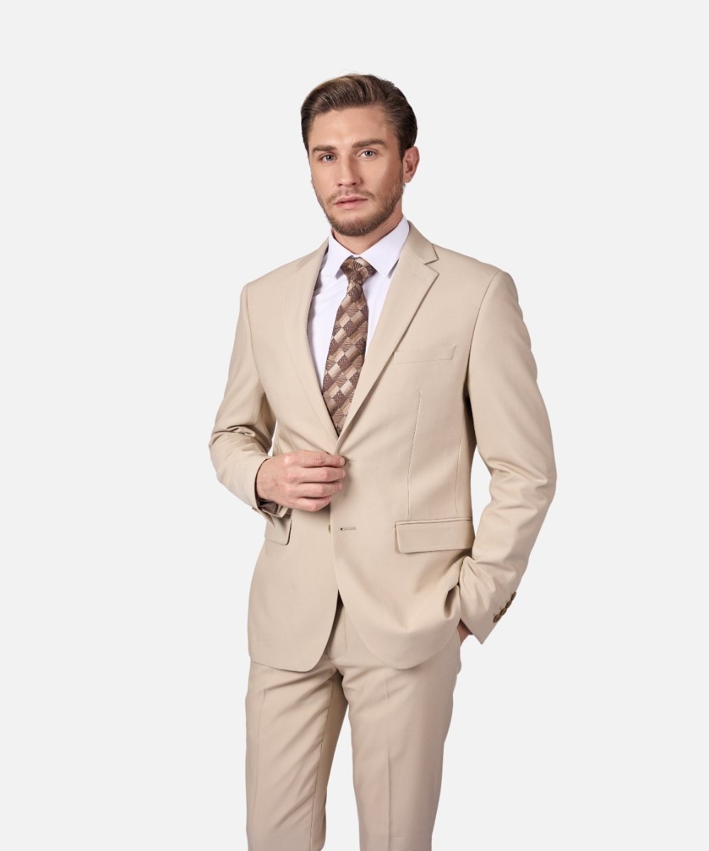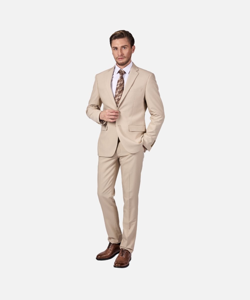 חליפת גברים אלגנטית בצבע בז’ בינוני בגזרת Regular Fit, המעניקה מראה קלאסי, נוח ומכובד. החליפה כוללת ז’קט מחויט ומכנסיים תואמים, ומתאימה לגברים שמעדיפים גזרה מעט רחבה יותר עם נוחות מקסימלית לצד מראה אלגנטי.