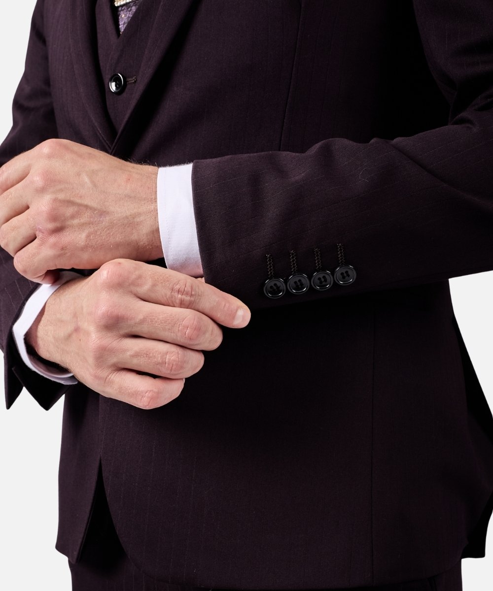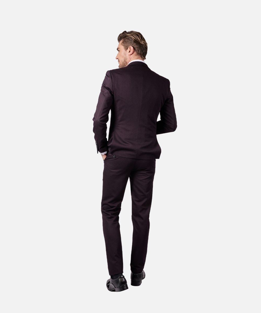 חליפת גברים יוקרתית בצבע בורדו כהה עם פס עדין, בגזרת Super Slim Fit, המעניקה מראה מחויט, אלגנטי ומרשים במיוחד. החליפה כוללת שלושה חלקים – ז’קט, וסט ומכנסיים מחויטים – ליצירת הופעה מלאה ומוקפדת בסגנון אירופאי מודרני.