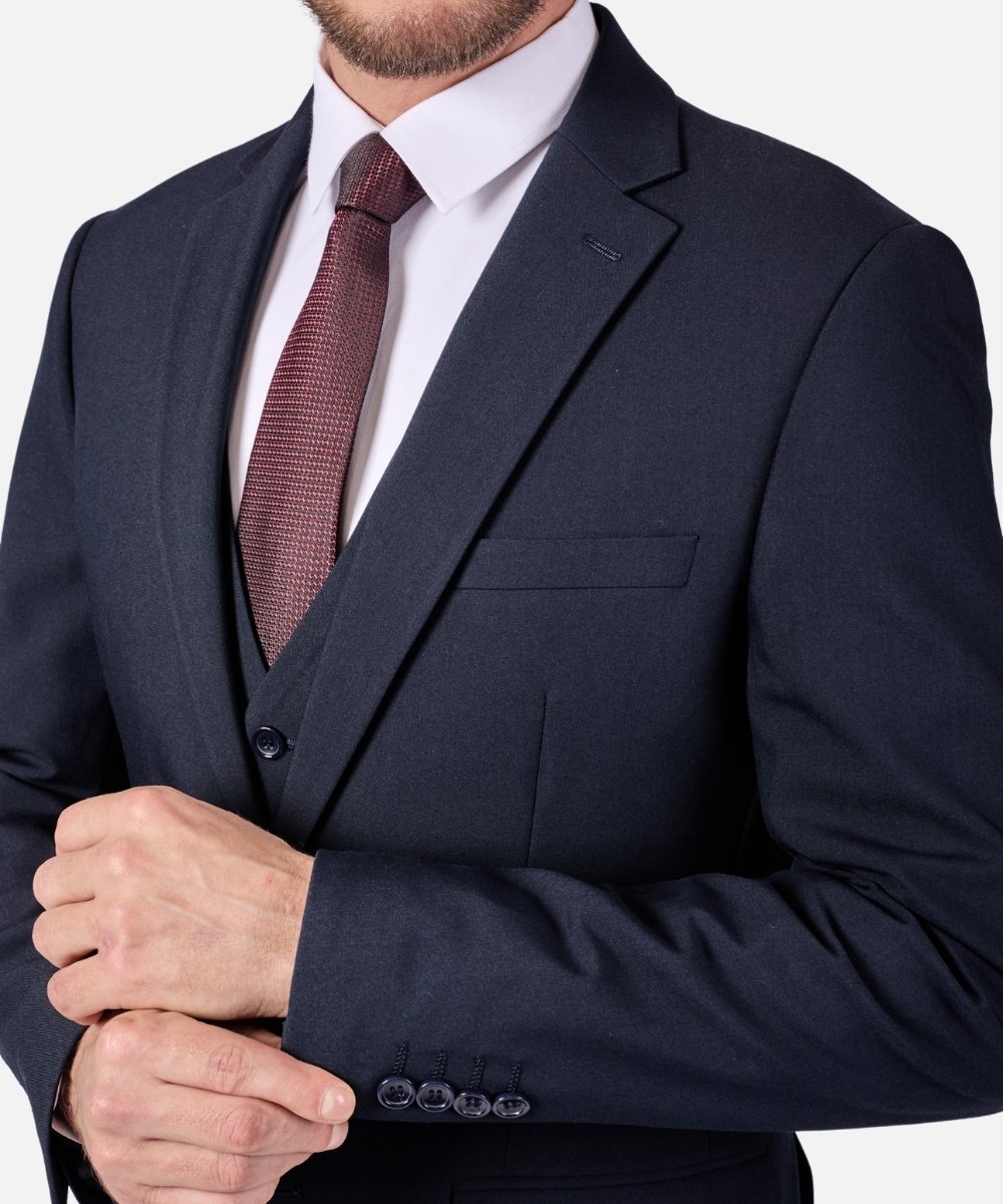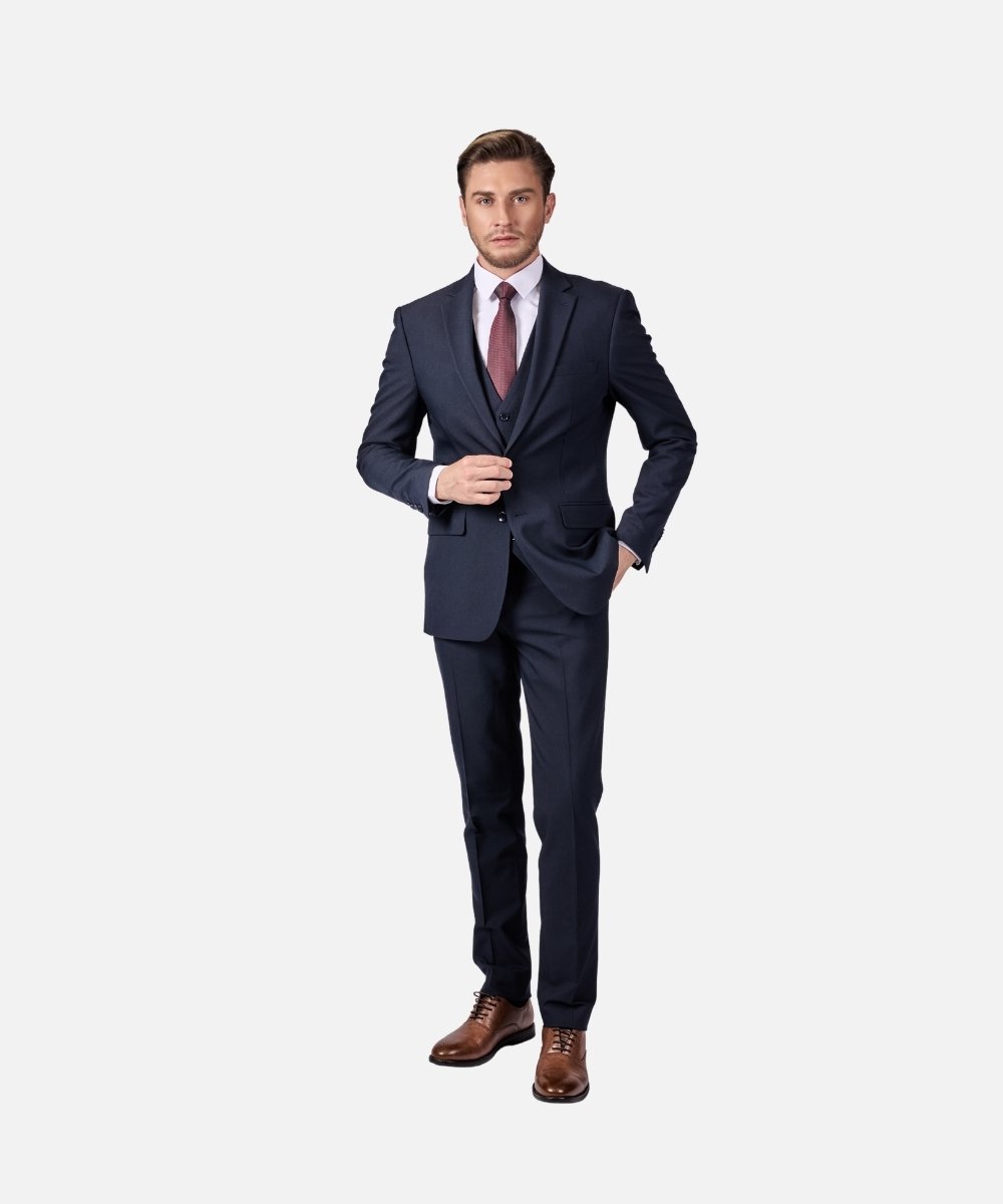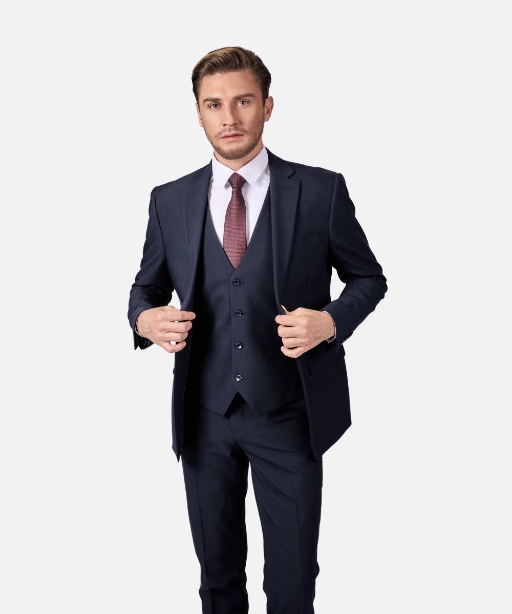 חליפת גברים אלגנטית בצבע כחול כהה קלאסי בגזרת Slim Fit, המעניקה מראה מחויט, חד ויוקרתי. החליפה כוללת שלושה חלקים – ז’קט, וסט ומכנסיים מחויטים, המשלבים סטייל אירופאי אלגנטי עם נוחות גבוהה לאורך כל היום.