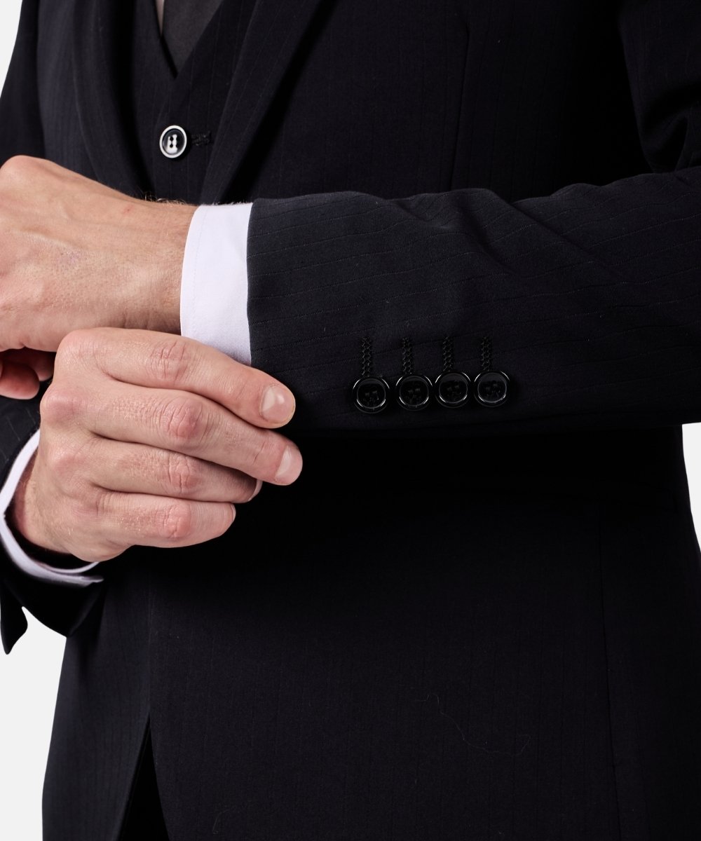 חליפת גברים אלגנטית בצבע שחור עם פס עדין בגזרת Super Slim Fit, המעניקה מראה מחויט, חד ומרשים במיוחד. החליפה כוללת ז’קט, וסט ומכנסיים מחויטים, ויוצרת הופעה יוקרתית ומוקפדת המתאימה לאירועים רשמיים ולמראה אלגנטי ברמה גבוהה.