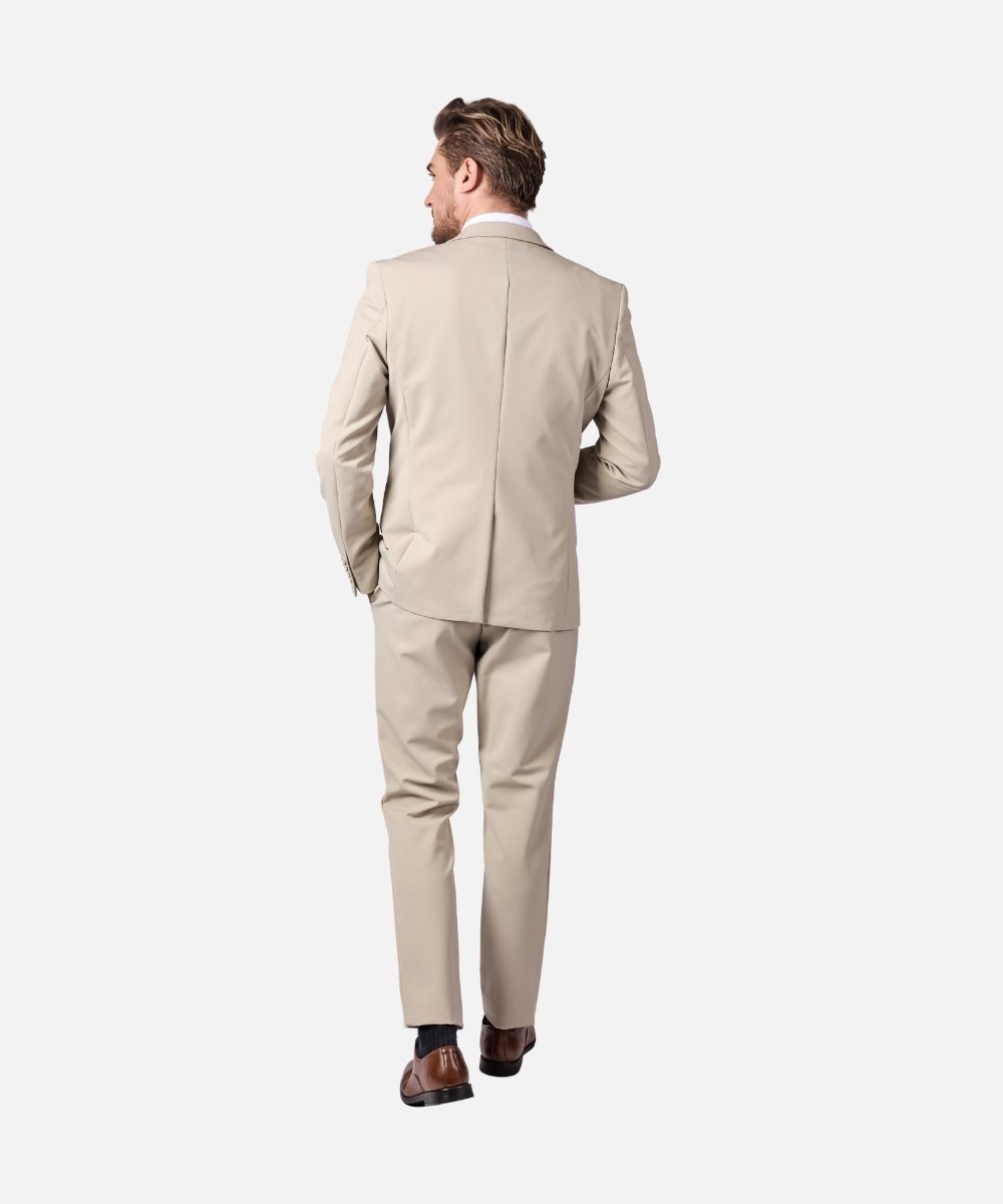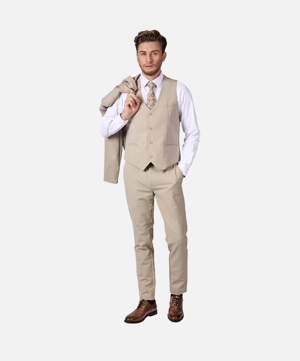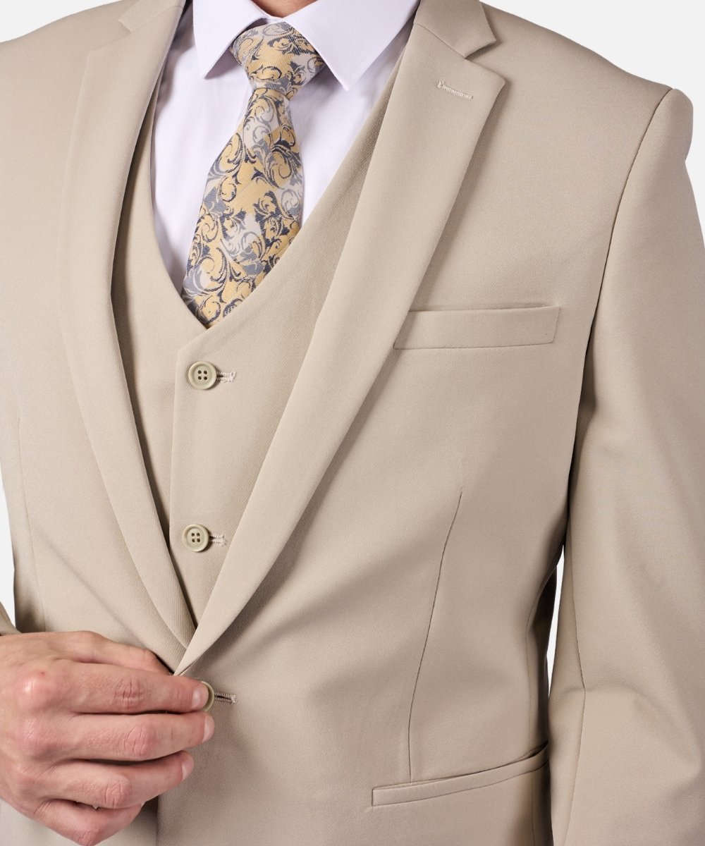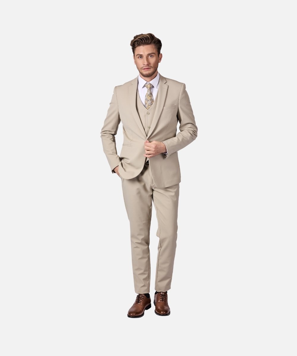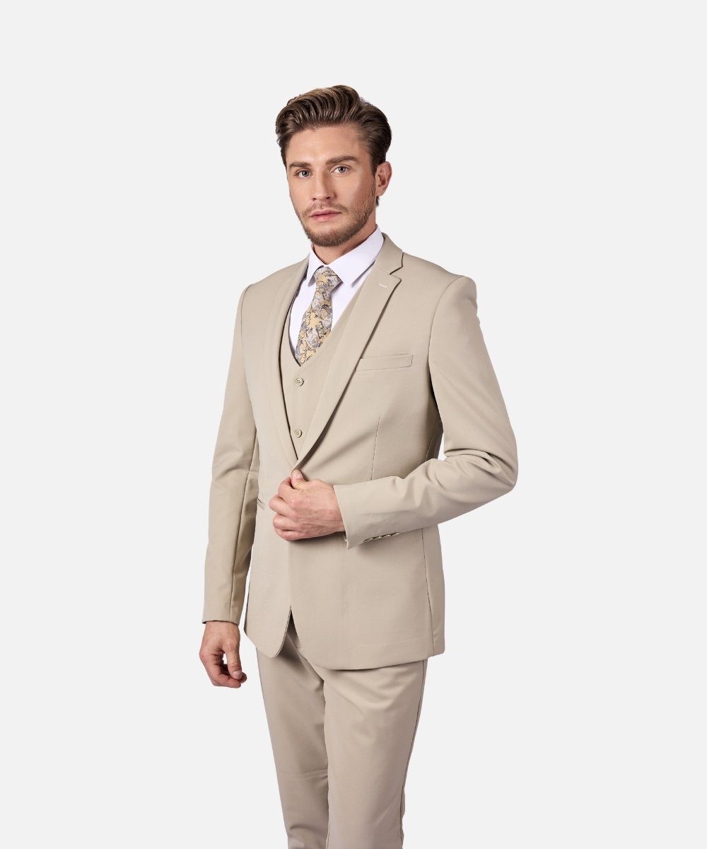 חליפת גברים אלגנטית בצבע בז' קלאסי בגזרת Super Slim Fit, המעניקה מראה מחויט, חד ויוקרתי. החליפה כוללת שלושה חלקים – ז’קט, וסט ומכנסיים מחויטים, ליצירת הופעה אלגנטית ומרשימה במיוחד.