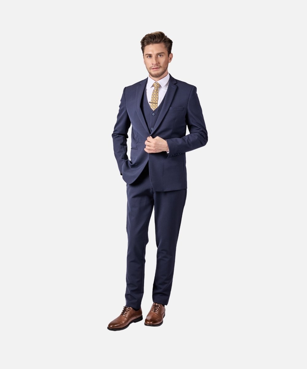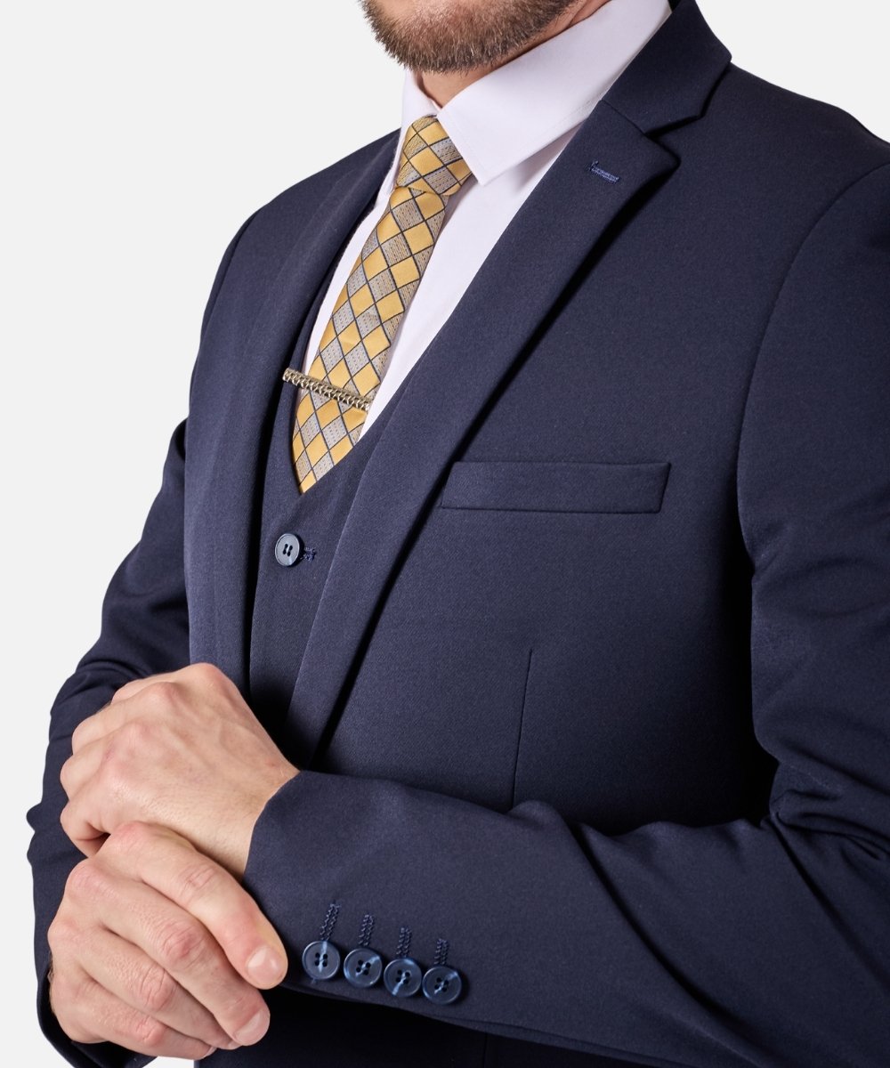 חליפת גברים אלגנטית בצבע כחול נייבי עמוק בגזרת Super Slim Fit, המעניקה מראה מחויט, חד ויוקרתי. החליפה כוללת שלושה חלקים – ז’קט, וסט ומכנסיים מחויטים – היוצרים הופעה אלגנטית ומרשימה במיוחד.