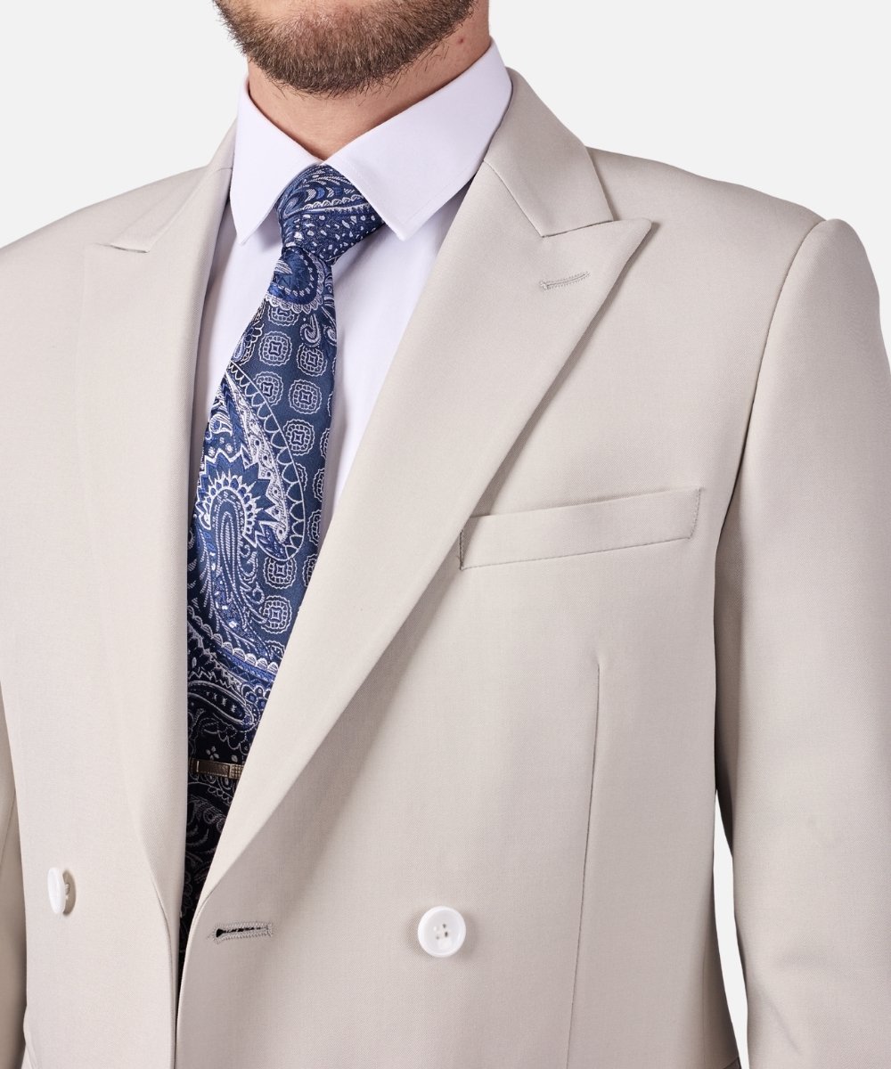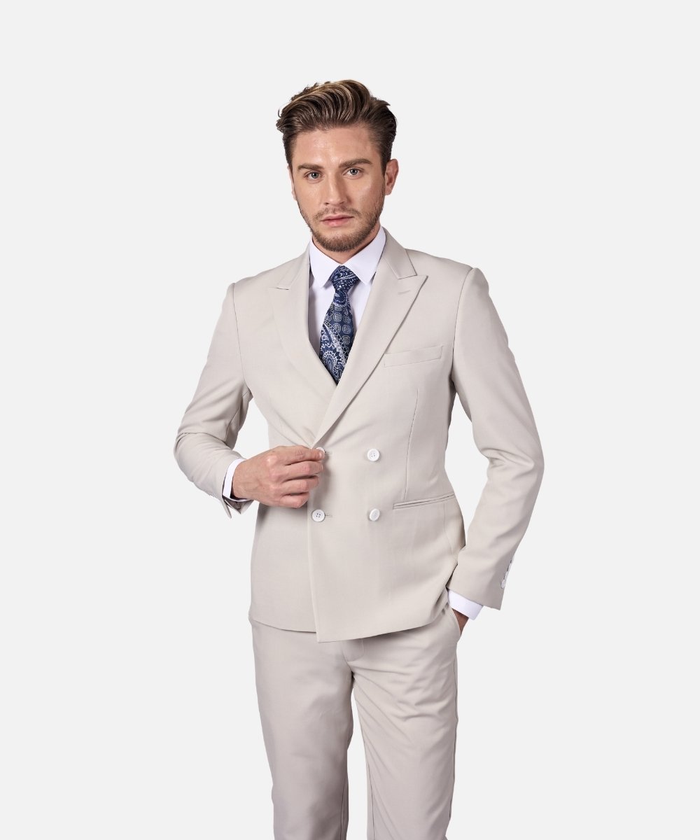 חליפת גברים אלגנטית בצבע אפור בהיר מודרני בגזרת Super Slim Fit, המעניקה מראה מחויט, חד ומרשים במיוחד. החליפה כוללת ז’קט בעיצוב כפול כפתורים (4 כפתורים) ומכנסיים מחויטים, המשלבים סטייל אירופאי יוקרתי עם מראה אופנתי ועדכני.